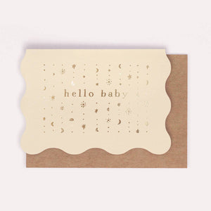 The twinkling pattern of gold foil stars and moons welcomes a new tiny human to the world on this gender-neutral new baby card. The soft yellow background, and unisex caption 'hello baby' on this new baby card means it is sweet send to any parents and any newborn. The unique shape is eye catching on shelf.