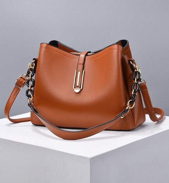 Medium size, solid colour, bucket style, shoulder handbag with chain strap and a longer cross-body strap option. Multi-compartments for phone and wallet storage.  PU leather material with gold metal detail.  Zip and popper fastenings.