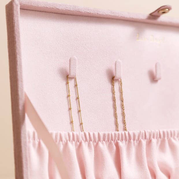 With a quilted lid covered in a velvety fabric, this box opens to reveal a variety of storage options for your prized pieces. The interior of the lid holds chain hangers for your necklaces or bracelets, the base is separated into sections for earrings before being completed with ring rolls. All covered with soft fabric to ensure your jewellery is protected.